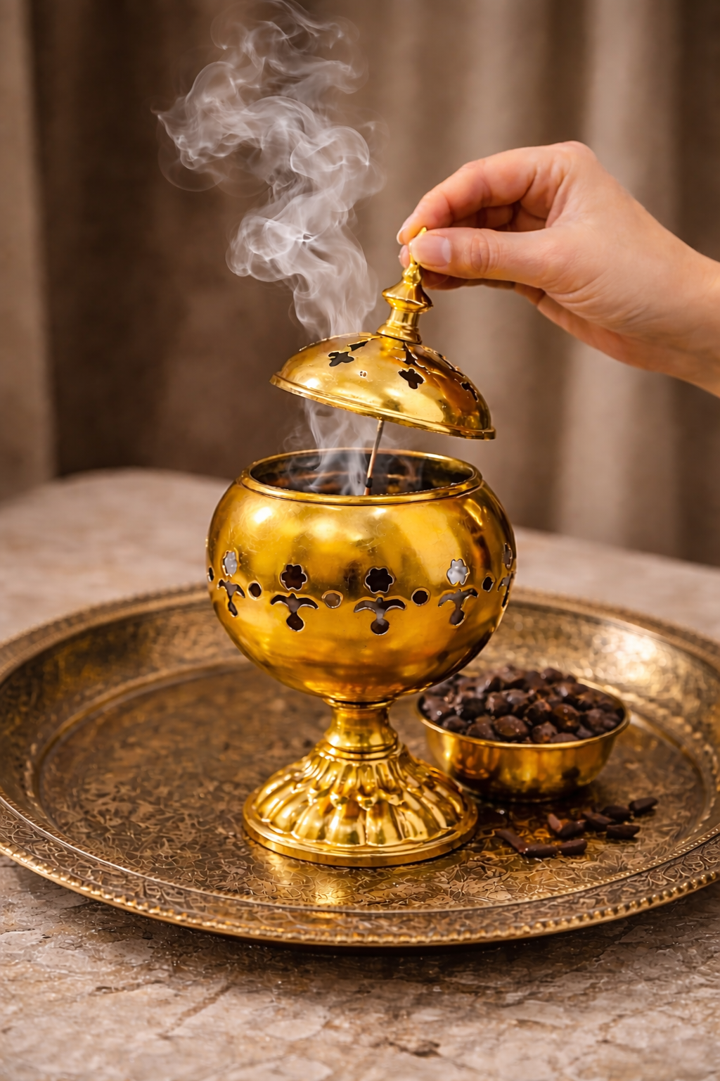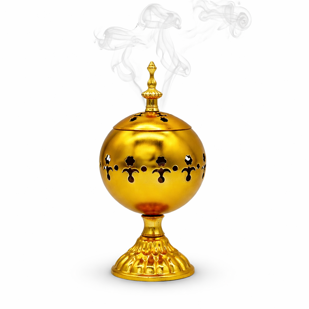 Ein Stück Räucherkohle im Inneren anzünden und darauf Bakhoor oder Weihrauch legen. Der Deckel sorgt für eine kontrollierte Rauchentwicklung und gleichmäßige Duftverteilung.